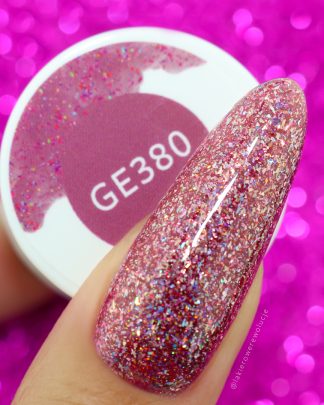 Mieć na paznokciach lakier hybrydowy GE380 Pleasure to prawdziwa przyjemność. Ten delikatny, różowy odcień podkreślony płatkami holograficznej folii na stałe zagości na dłoniach Twoich klientek.