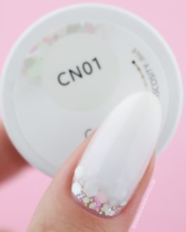 Candy Gel CN01 zawiera w sobie białe drobinki w kształcie heksagonów, mieniących się w odcieniach różu, błękitu i fioletu.