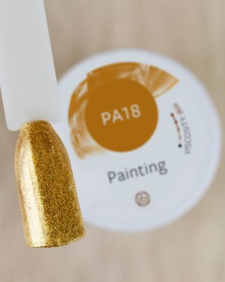 Żel do zdobień Painting PA18 to unikatowy produkt z kolekcji żeli kolorowych. Jego minimalna warstwa dyspersyjna pozwala na malowanie po nabłyszczonej powierzchni. Dzięki bardzo mocnej pigmentacji wystarczy jedna warstwa, by uzyskać doskonałe krycie. Konsystencja przypominająca farby akrylowe sprawia, że jest idealny do malowania technikami One Stroke, Zhostovo oraz metodą Micropainting. Żel jest dostępny w kolorze złotym i posiada pojemność 5g.